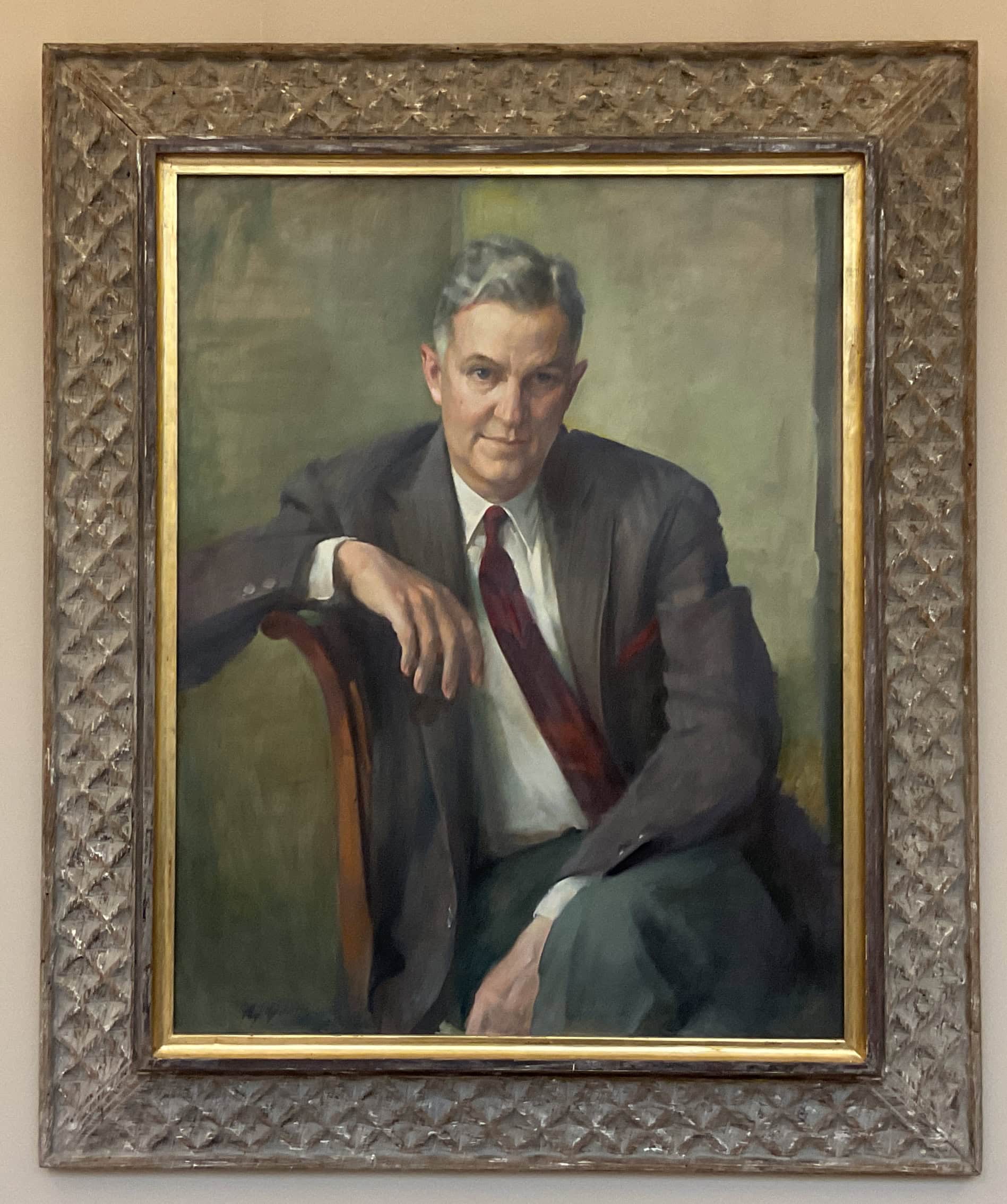 The Holyoke Public Library welcomed a recent gift of an oil portrait of William Dwight (1903-1996) from the Dwight family. The artist was Roy Spreter, a successful American illustrator and portraitist. It has been given a place of honor in the History Room, near the portraits of Dwight’s parents, Minnie and William G. Dwight, long-time owners, publishers, and editors of the Holyoke Daily Transcript and Holyoke Transcript-Telegram. William Dwight became editor of the Transcript upon his father’s death in 1930, while his mother became publisher.